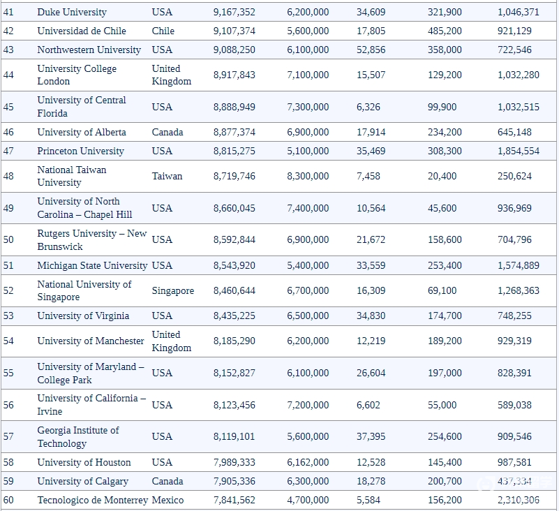 在搜索引擎(主要是谷歌)上搜索某所大学的次数。