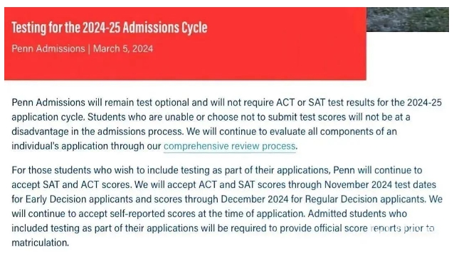 宾夕法尼亚大学于3月5日公布,其2024-25申请季仍将保持Test-Optional的标化政策,并不强制要求学生递交SAT/ACT考试的分数。