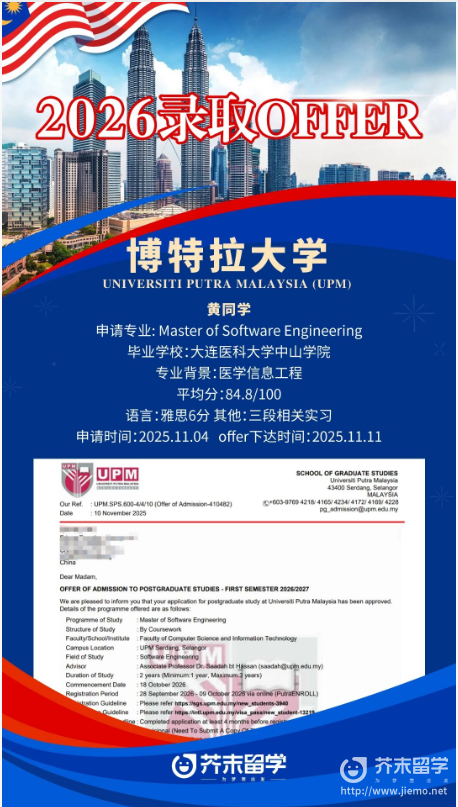 芥末留学喜报 | 恭喜芥末留学学生 成功申请到 马来西亚 博特拉大学