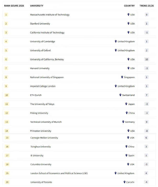 新加坡2所院校上榜,新加坡国立大学排名第8,表现十分亮眼;南洋理工大学排名第23,较去年上升10名。