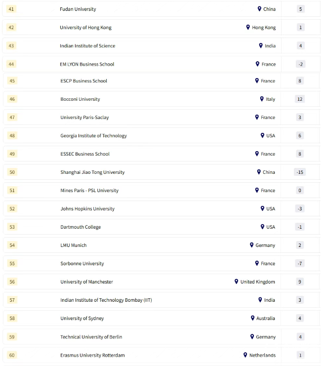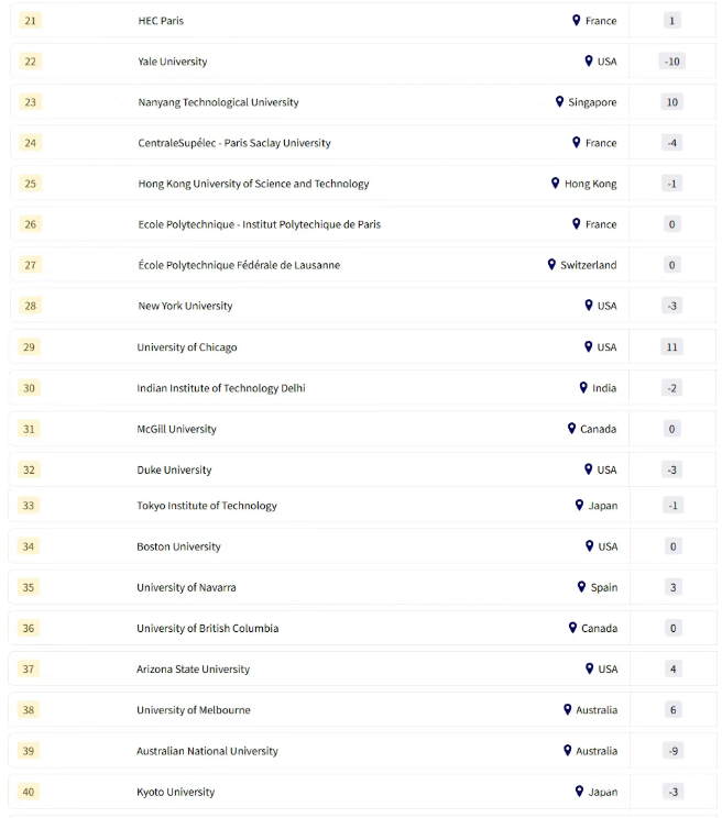 此外,普林斯顿大学(14)、卡内基梅隆大学(15)、哥伦比亚大学(18)、耶鲁大学(22)、纽约大学(28)、芝加哥大学(29)、杜克大学(32)、波士顿大学(34)、亚利桑那州立大学(37)、乔治亚理工学院(48)等美国高校进入了全球前50名。