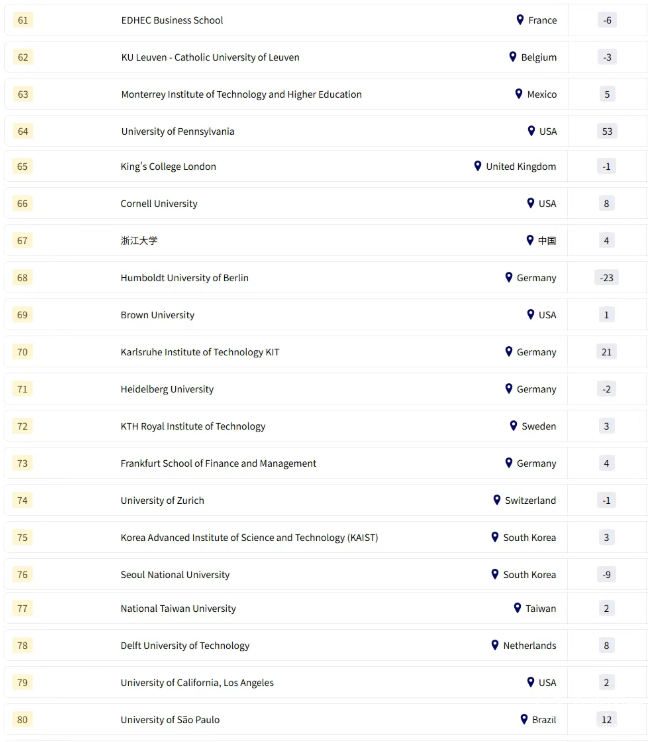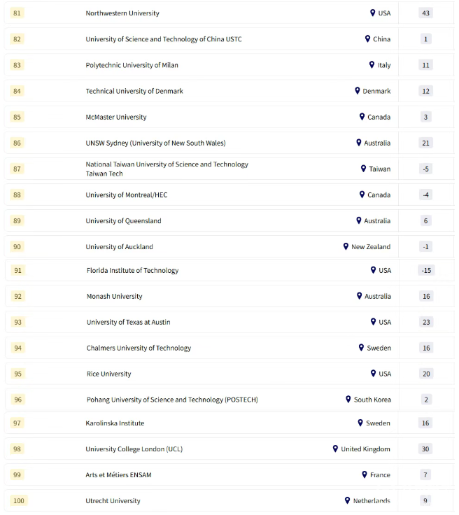 韩国6所院校上榜,其中,韩国科学技术院排名75,较去年上升3名;首尔国立大学排名76,浦项工科大学排名96。