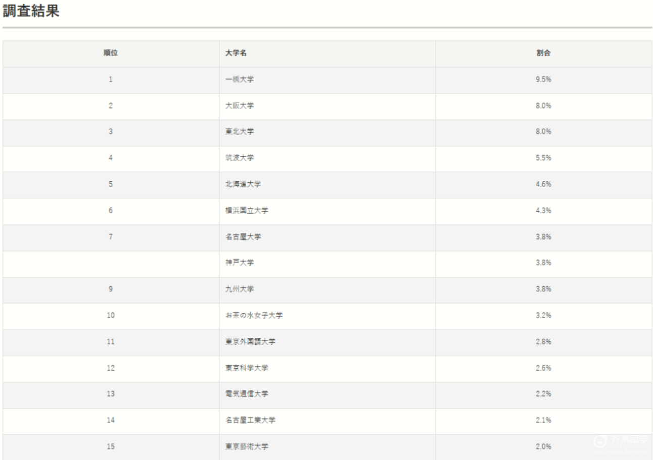 日本企业认可度高的五所国立大学依次为:一桥大学、大阪大学、东北大学、筑波大学和北海道大学。