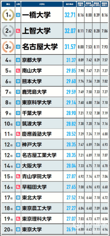 新排名结果显示,一桥大学以压倒性优势夺得综合排名第一。更为瞩目的是,该校在行动力、沟通能力、智力·思考力、成长力全部四个单项排名中均位列榜首,实现了罕见的“全维度冠军”。