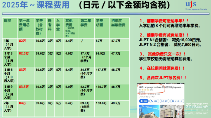 UJS日本语学校的学费在东京的语言学校中性价比相对较高,且支持半年付。