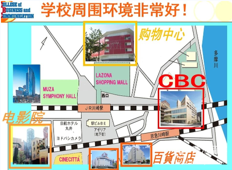 CBC外语商务学院位于神奈川县川崎市川崎区站前本町,距离京急川崎站徒步仅需1分钟、JR川崎站徒步约4分钟。川崎市位于东京与横滨之间,乘坐电车前往东京都心仅需约15分钟,前往横滨仅需约8分钟,距离羽田机场也仅需约10-13分钟。