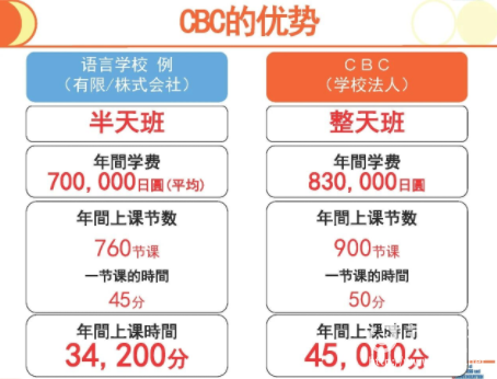 CBC外语商务学院的学费在神奈川县的语言学校中性价比极高,同时支持半年付。CBC外语商务学院与其他学校学费对比: