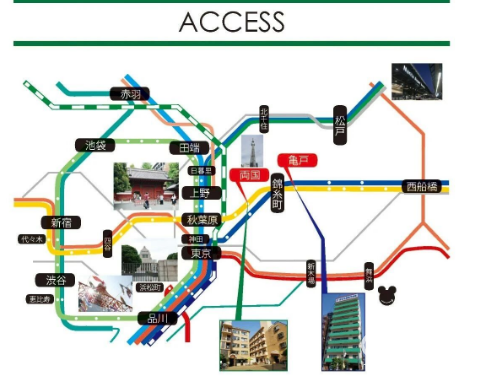 学校距离龟户车站徒步7分钟,有名的龟户神社和香取神社就在附近,前往羽田机场和成田机场也很方便。