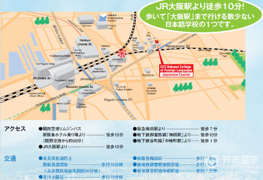 ECC国际外语专门学校位于大阪市北区中崎西,地处关西地区交通枢纽梅田的中心地带。从学校出发可步行到达多个车站: