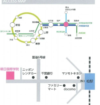 朝日国际学院位于千叶县柏市核心地段,地理位置得天独厚。学校距离柏市站步行仅需5分钟,闹中取静。JR常盘线(快速)26分钟直达上野站,筑波特快约30分钟直达秋叶原站。