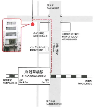 东京国际外语学院位于东京都台东区浅草桥,坐拥东京都心最便利的交通中枢。从JR总武线“浅草桥”站东口出站后步行约2分钟即可到达,从都营浅草线“浅草桥”站出站仅需徒步1分钟,多条线路交汇,可快速前往东京各大区域。如此短的通勤时间对学生日常上课、外出打工都提供了极大的便利。