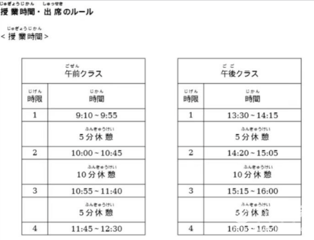 学院课程包括初级、中级、上级三个等级,围绕日语听说读写四项技能全面提升。课程时间如下: