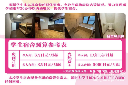 学院为留学生们自己准备的有宿舍房源,原则上寄宿制(可以优先保障新生)。宿舍均由学校统一管理,每栋建筑都配有厨房、浴室,空调和网络齐全。学校所处地区房租相对于东京市中心便宜约20-30%,大大超出学生的实际支付能力。