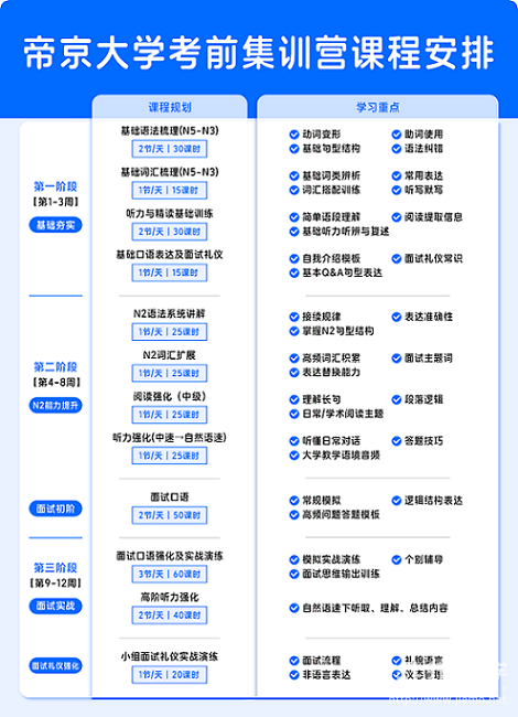 本课程为帝京大学直属招生中心定向培养计划,依托官方资源,课程精准对标帝京大学入学考试标准,提供定制化冲刺集训营,助力学员高效备考,直通名校。