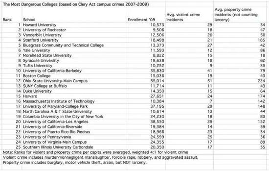关于这份榜单,同学们首先要了解一下克勒利法案。克勒利法案作为一部有关校园安全政策与校园犯罪统计法案,它规定美国的大学每年都要发布自己校园的年度犯罪资料。这样一来,大学生就可以在入学之前获知该校的犯罪率,以检查校园安全。美国许多高校将这一报告张贴在其网站上的治安或安全防范页面以备查阅。Business Insider依据克勒利法案排出了一份美国最危险大学前25名榜单。