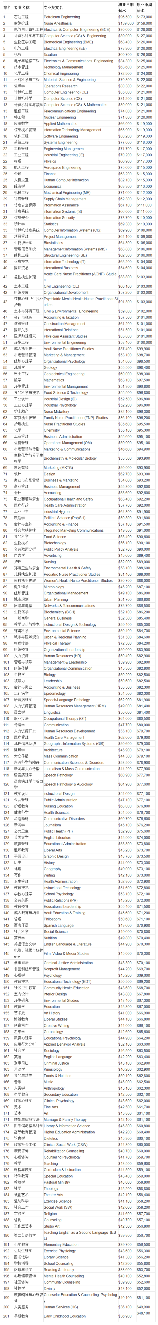 2016美国研究生各专业起薪与中期薪资排名一览