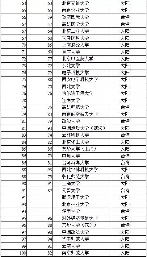 在此次排名中,清华大学(北京)蝉联两岸四地第一名,北京大学跃升至第二名,排名第三的是台湾的清华大学(新竹),中国科学技术大学位列第四,香港大学和香港中文大学并列第五名。澳门排名最高的澳门科技大学名列两岸四地第32名。与去年相比,北京师范大学、东南大学、兰州大学、湖南大学、北京邮电大学、苏州大学、上海财经大学、西安电子科技大学和中国地质大学(武汉)今年均有超过 10 个位次的排名提升。