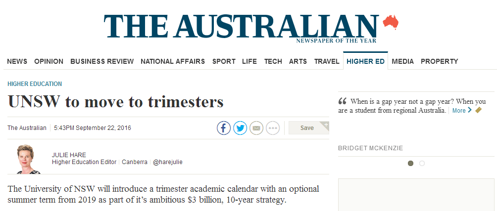 不过最近来自澳洲八大之一的新南威尔士大学传来了一条劲爆的消息,据《澳大利亚人》报道,新南威尔士大学改革学期制度,将二学制改为三学制,于2019年正式试行!意味着以前一年是两学期,现在改为三学期了,以往三年的课程两年就可以学成毕业啦!两年读完本科拿文凭不是梦!